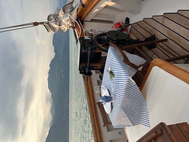 Un'idea suggestiva per una cena in navigazione servita sul ponte con tavolini e sedie, costeggiando la costa, accompagnata da musica Live , situazione perfetta per un evento romantico ed esclusivo.