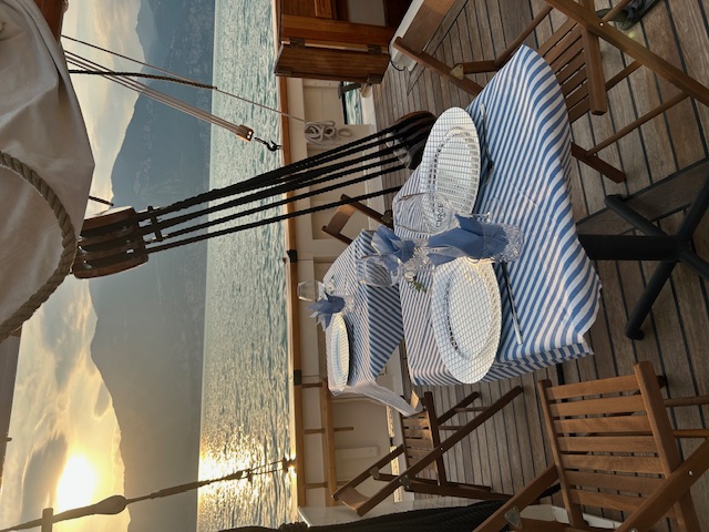 Eine stimmungsvolle Idee fuer ein Abendessen an Bord, serviert auf dem Deck mit Tischen und Stuehlen, entlang der Kueste, begleitet von Live-Musik, die perfekte Kulosse fuer ein romantisches und exklusives Event.