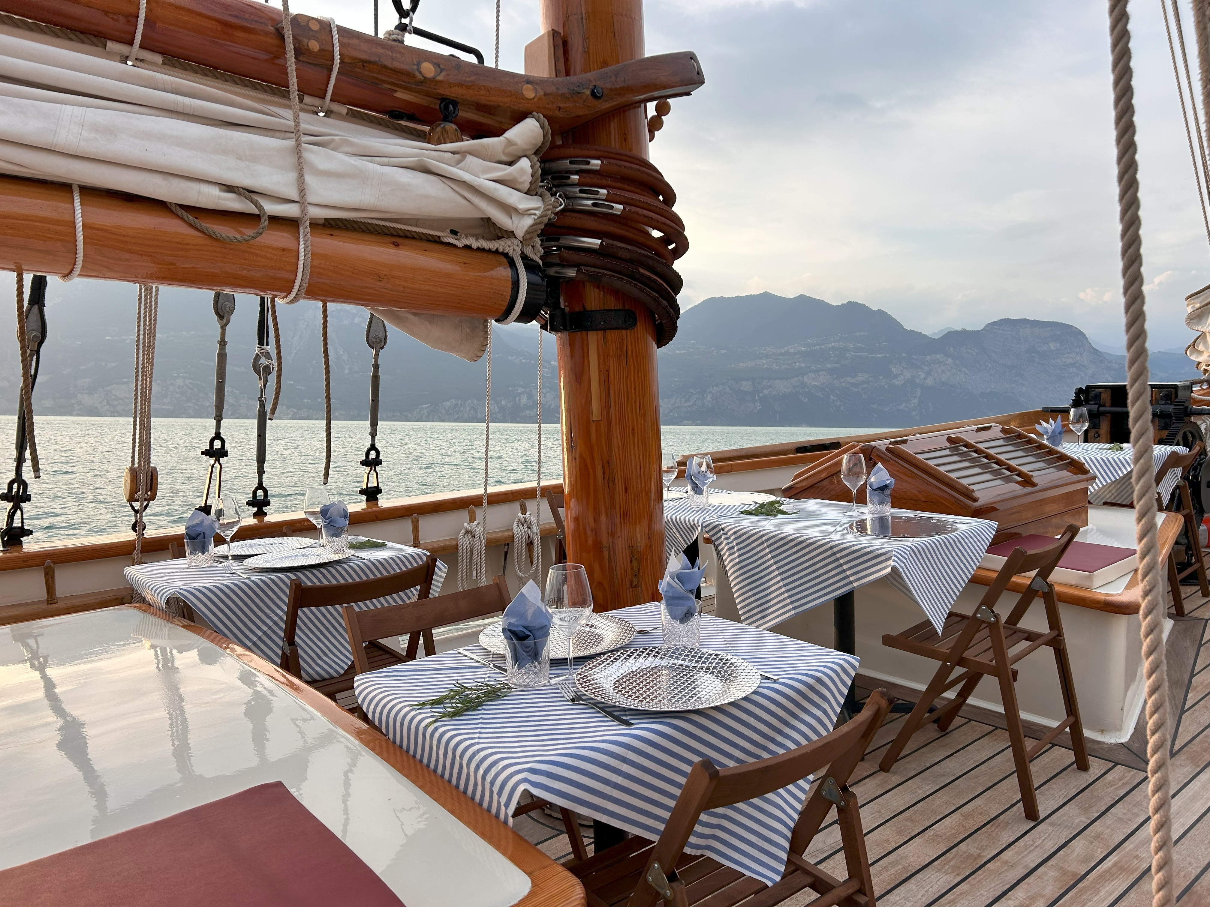 Un'idea suggestiva per una cena in navigazione servita sul ponte con tavolini e sedie, costeggiando la costa, accompagnata da musica Live , situazione perfetta per un evento romantico ed esclusivo.